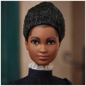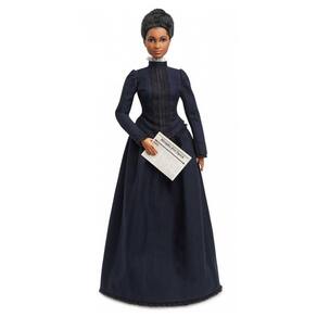 A boneca Barbie Inspiring Women Ida B. Wells homenageia a jornalista e ativista pioneira na defesa dos direitos civis e da igualdade racial e de gênero. A personagem usa vestido azul tradicional de época com saia longa e mangas compridas, trazendo detalhes de renda na região do busto, gola e cintura. O visual é complementado por botões decorativos frontais e modelagem ajustada na parte superior, remetendo ao estilo de finais do século XIX.