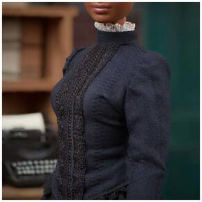 A boneca é esculpida à semelhança de Ida B. Wells, com penteado preso característico e expressão facial séria, adequada à figura histórica representada. O corpo articulado permite ajustes de braços, cabeça e pernas para diferentes poses em prateleiras, vitrines e cenários educativos. Acompanha acessório de jornal “Memphis Free Speech”, referência ao periódico que ela coeditou ao denunciar injustiças contra a população negra.
