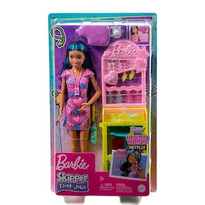 As bonecas e conjuntos Barbie® Skipper First Jobs™ permitem que as crianças explorem o mundo do trabalho com a irmã adolescente da Barbie®. Inspirado no filme Skipper e Big Babysitting Adventure™, este conjunto constrói o currículo do boneco Skipper™ com um trabalho em um estúdio de perfuração de orelhas. A imaginação pode brincar com uma ferramenta que perfura a orelha da boneca para adicionar brincos - 10 pares estão incluídos! As crianças podem exibi-los no estande e encenar aventuras relacionadas ao trabalho com peças adicionais de contar histórias. A boneca não pode ficar sozinha. Cores e decorações podem variar.