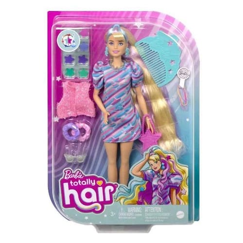 Barbie Totally Hair tem um cabelo extralongo com mechas para os mais diversos penteados. Vem com vários acessórios para incrementar o look e os cabelos.