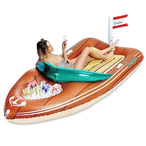 - DESIGN EXCLUSIVO. Design exclusivo de barco de madeira, aproveite ao máximo sua diversão com esta espreguiçadeira para a água! Com o refrigerador reforçado, não há necessidade de sair da água. Este flutuador de piscina com espreguiçadeira mantém todos felizes e hidratados.