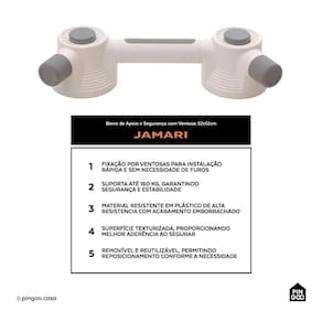 A Barra de Apoio e Segurança com Ventosa Jamari Pingoo.casa proporciona estabilidade e segurança para banheiros, garantindo apoio extra para idosos, pessoas com mobilidade reduzida ou usuários que necessitam de firmeza em locais que exijam apoio firme, como entrar e sair do box ou utilizar o vaso sanitário.