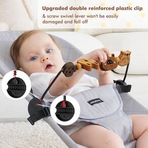 - Clipes de plástico reforçado atualizados: a barra de brinquedo Baby Bouncer com novos clipes de plástico reforçado atualizados, o uso de produção de moldes desenvolvida por você mesmo, a posição de contato dos clipes de plástico reforçado e a substituição dos parafusos rotativos aparafusados não facilitarão a quebra e o desprendimento da situação. O material do clipe de plástico é atualizado para material fosco, que é mais texturizado e não tem partes salientes. Mais fácil de instalar e remover