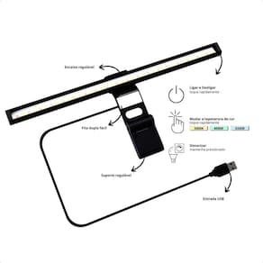 Benefícios do produto: possui três níveis de intensidade, formato slim e é facilmente conectável através de usb com um cabo de 1,5 metros de comprimento. Dimensões axlxp cm : 2 x 9 x 29,5 Formato: retangular Cor da luz: 6500k frio - 4000k neutro - 3000k quente Produzido em: plástico de engenharia, alumínio, placa de circuito impresso e componentes eletrônicos Voltagem: 5 volts vdc Alimentação: usb 5v 1a Cor acabamento: preto Potência: 5w Fluxo luminoso: 245 lumens Irc: 80 Comprimento do cabo: 1.5 metros, altura regulável Garantia: 90 dias junto ao fabricante Aplicação: mesa Vida útil: 15.000 horas Acompanha lâmpada: não necessita, led já integrado Grau de proteção: ip20 Ajuste de intensidade dimerizar : sim