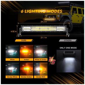 ATUALIZAR 6 MODOS DE ILUMINAÇÃO A barra de luz de 55 centimetros do feixe auxiliar com kit de chicote de fiação personalizado é muito adequada para luzes off road, luzes de advertência, faróis de neblina, luzes de direção ou luzes de trabalho. Você pode alternar entre 6 modos de direção através do nosso controle remoto luz de direção branca, luz de neblina âmbar, luz combinada branca e âmbar, luz intermitente branca, luz intermitente âmbar, luzes estroboscópicas branca e âmbar.