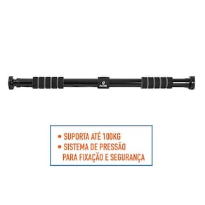 BARRA AJUSTAVEL - Possui sistema de pressão para fixação, adaptável a qualquer batente de porta entre 63 e 96cm. Sua estrutura em aço, material resistente que suporta até 100 kg, com pegada em espuma para maior conforto durante o exercício