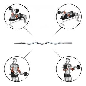 - ombro - bíceps - tríceps francês - costas - remada curvada - membros inferiores - desenvolvimento - elevação frontal - rosca inversa - pullover - antebraço - entre muitos outros exercícios.