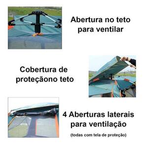 Com medidas de 260x260x170cm, essa barraca pode acomodar confortavelmente de 4 a 5 pessoas para dormir e até 6 a 7 pessoas para ficar sentadas. Além disso, ela possui 2 portas e 2 janelas, proporcionando uma ótima ventilação. O teto conta com uma tela para evitar a entrada de insetos.
