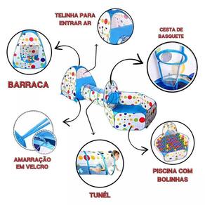 Barraca Cabana Toca Túnel Infantil 3x1 Piscina De Bolinhas- Diversão garantida com esta toca colorida 03 em 01- São duas tocas e um túnel para você passar de uma para outra.- A Toca é o brinquedo ideal para fazer a alegria da garotada, a toda hora.- Ótima para brinquedotecas, quartos de brinquedo, garagem, festas infantis, etc.ESPECIFICAÇÕES:Marcas: POP BrinquedosModelo: TOY23005-AZMontagem necessária: SimTipo s de material: Plástico, Poliéster, Fibras TêxteisItens Inclusos: sacola para armazenagemIdade recomendada: 3 anos e acimaForma: Túnel Infantil 3x1 Piscina De BolinhasCor: AzulCertificação: INMETRODimensões:Embalagem:49 x 8 x 49 peso: 1 kgMontado:- Toca triangular C x A - 90 x 91 cm;- Túnel C x D - 100 x 46,5 cm;- Toca quadrada C x A - 83 x 86 cmNÃO ACOMPANHA BOLINHASGarantia de 90 diasHomologação Inmetro: CE-BRI/ICEPEX-I 02597-42-1