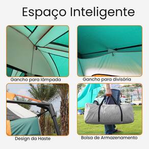 Grande espaço: Dimensão interna 380cm de comprimento 260cm de largura 190cm de altura, cabem 6 8 em colchões de ar, pode acomodar 9 12 pessoas em PÉ, 3 portas com malha, 3 janelas com malha.