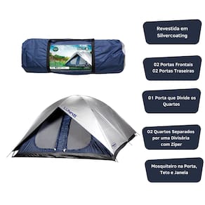 Próprio para 8 pessoas, ela possui local para pendurar lanterna na parte de dentro da barraca e conta com mosquiteiro na porta, teto e na janela traseira.