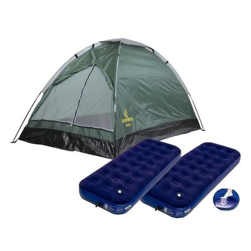 Barraca acampamento iglu 3 pessoas koala - guepardo + 02 colchão inflável multiuso solteiro com fole embutido - moruma das barracas mais vendidas e procuradas da guepardo conheça a barraca acampamento iglu 3 pessoas koala na cor verde, com estrutura projetada altamente resistente, além de amplo espaço interno e piso com tecnologia anti fungoa guepardo é uma renomada fabricante de equipamentos e acessórios para atividades outdoor, dentre sua gama de produtos, encontra-se facas de sobrevivência, barracas, sacos de dormir, entre outros. Investindo em tecnologia de ponta, a marca inovou na eficiência de seus equipamentos ao longo dos anos, permitindo que seus clientes tenham ainda mais qualidade.A barraca koala é a escolha ideal para casais que gostam de aventuras e procuram praticidade e eficácia em suas viagens na natureza. Projetada para acomodar confortavelmente duas pessoas, ela é um exemplo de resistência e praticidade.Sua estrutura é feita de varetas em fibra de vidro conectadas por elásticos internos feitos de material 100% natural, com o sistema nano-flex. Isso permite uma montagem rápida e fácil, garantindo estabilidade e resistência mesmo em condições adversas.Conforto interno e organização:por dentro, a barraca é revestida com poliéster 100%, criando um ambiente aconchegante para suas noites outdoor. Além disso, possui um bolso interno prático para organizar pequenos objetos, mantendo o espaço arrumado.Proteção contra insetos e umidade:a tela mosquiteira de poliéster no-see-um impede a entrada de insetos, permitindo noites tranquilas. O piso em polietileno de alta resistência e antifúngico protege contra a umidade do solo, mantendo o ambiente seco e agradável dentro da barraca.Portabilidade e praticidade:com apenas 1,50 kg e dimensões compactas de 2,05 x 1,60 x 1,15 metros, esta barraca é extremamente portátil e fácil de transportar. Acompanhada por um conjunto completo de estacas, cordas de fixação, varetas e uma sacola para transporte, ela se torna uma companheira confiável em todas as suas aventuras.Adequada para climas secos:é importante notar que este modelo não possui sobreteto, tornando-o inadequado para uso em climas chuvosos. No entanto, em condições de clima seco, esta barraca oferece conforto e proteção ideais para suas noites ao ar livre sob as estrelas.Em resumo, a barraca de acampamento koala para 3 pessoas da guepardo é uma escolha inteligente para casais que buscam uma barraca leve, fácil de montar e altamente funcional para suas aventuras na natureza. Desfrute de noites confortáveis e seguras em sua próxima escapada ao ar livre com esta barraca confiável.