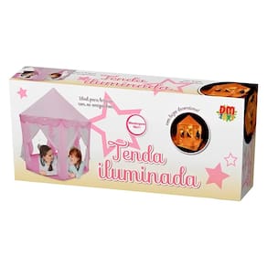 ESPECIFICAÇÕES: Idade recomendada: a partir de 3 anos Dimensões da embalagem: 48 x 20 x 10 cm (C x L x A) Dimensões da barraca: 140 x 140 x 135 cm (C x L x A) Conteúdo: 1 cobertura para tenda, 1 cordão de luzes e peças para montagem Material: Poliéster e plástico acessórios: Inclui luzes decorativas (utiliza 3 pilhas "AA", não inclusas) Marca: DM Toys