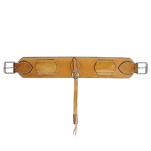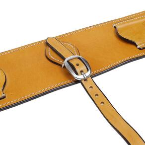 Barrigueira traseira Rodeo West fabricada em couro na cor Amarela com 12cm de largura, possui fivelas de metal, costuras reforçadas e conector de barrigueira em couro com fivela para regulagem.