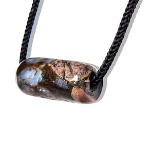 Nome: Riolita Rosa Natural Cor: Rosa suave com padrões marrons e brilho sutil (foto ilustrativa) Formato: Barril rolado com furo longitudinal (3 mm aprox.), ideal para fios e cordões Claridade: Semitransparente com brilho vítreo delicado Medidas: 25 a 30 mm (pode variar conforme o lote) Quantidade: 1 unidade
