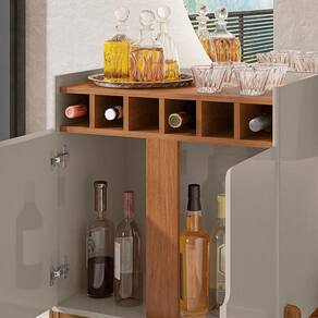 Barzinho Com 2 Portas e Adega Para Sala de Jantar 50522, com seu design moderno, irá levar versatilidade e charme à seu cômodo, seja ele, sala de jantar ou sala de estar. Possui estrutura em MDF de 15mm, MDP de 15mm e 25mm, 02 portas de MDF usinadas com detalhe curvo e dobradiças com sistema soft-close, para um fechamento mais suave, o que permite uma ótima experiência em seu uso diário, além disso, possui 06 adegas embutidas, para manter suas garrafas preferidas na posição horizontal, Sua pintura conta também com acabamento Print Wood, patenteado e exclusivo Casa D, garante ao produto maior qualidade e durabilidade como nenhuma no mercado possui. Suporta até 32 kg distribuídos, possibilitando a disposição de seus objetos, apesar de compacto, seu espaço interno e externo permitem armazenamento de diversos itens. Para maior segurança, os pés são elaborados em madeira maciça (Pinus) com pintura laqueada e sapatas para evitar riscos no piso no qual for instalado. Além de garantir um visual contemporâneo, tudo isso priorizando a segurança e o charme que seu ambiente necessita. Este móvel chegará em sua casa separado em 01 volume.