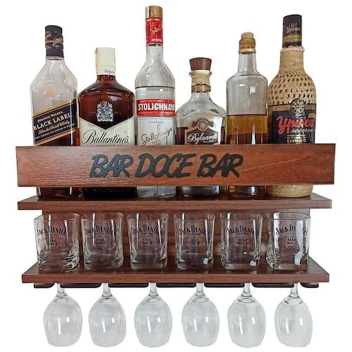 Barzinho de Parede - Bar Doce Bar - 54x28 - Imbuia Que presente exclusivo para seu amigo a , pai, mãe, namorado a , familiares, etc., em Se você está à procura de algo EXCLUSIVO, DIFERENCIADO, BONITO e com acabamento de PRIMEIRA para dar de presente ou para você mesmo acabou de encontrar. impressione á todos deixando suas bebidas bem visíveis e organizadas com o nosso BARZINHO de PAREDE. Esse barzinho ocupa pouquíssimo espaço em seu ambiente, porém chama muito a atenção de quem o vê, justamente por ser um produto diferenciado dos demais existentes no mercado. Não Perca Tempo, peça já seu BARZINHO Principais Características: Feito 100% em MDF 15mm Bilaminado Capacidade Aproximada para 6 Garrafas + 6 Copos + 6 Taças Dimensões: 54cm de largura x 28cm de altura x 13cm de profundidadeAcompanha parafusos e buchas para fixação. Indicações de Uso:Pubs Home Bar Varandas e Sacadas com temática Gourmet Cozinhas Salas em Geral ChurrasqueirasObs: Imagem Meramente Ilustrativa, Copos, Garrafas e Demais Acessórios Não Acompanham o Produto