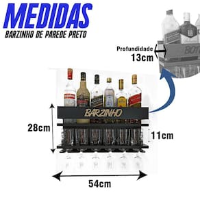 Principais Características: Feito 100% em MDF 15mm Bilaminado Capacidade Aproximada para 6 Garrafas + 6 Copos + 6 Taças Dimensões: 54cm de largura x 28cm de altura x 13cm de profundidade Acompanha parafusos e buchas para fixação.