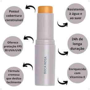 A base é multifuncional, fácil de aplicar e ideal para todos os tipos de pele. São três funções - base, contorno e corretivo. Disponível em 50 tonalidades que celebram a pluralidade de cada tom de pele, pioneira em representar a brasilidade. Possui cobertura construível - de nível a alta - sem causar ressecamento ou deixar a pele oleosa. Com sua fórmula cremosa que desliza facilmente, garante aplicação rápida e um efeito iluminado maravilhoso. Enriquecido com Vitamina E (ativo antioxidante) , resistente à água e ao suor, 24h de longa duração, oferecendo proteção FPS 30 UVA/UVB, auxilia na proteção contra a Luz Azul, além de ser livre de parabenos e não comedogênico.