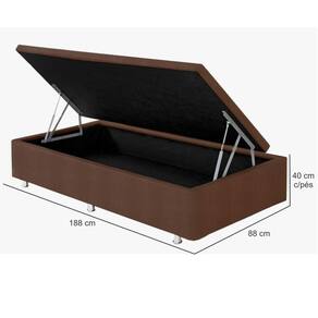 Estrutura: Madeira de Reflorestada, seca em estufa Revestimento: Externo em Tecido LinhoRevestimento: Interno em TNTEspessura: Tampo de 5 cmFerragens: Articulações com amortecedores a gásPés: Sim, em PVC aluminizada, com altura de 6 cm Baú: Sim, com profundidade de 24 cmUtiliza: Colchão de solteiro com largura de 88 cm x 188 cm de profundidadeDimensões do produto Montado