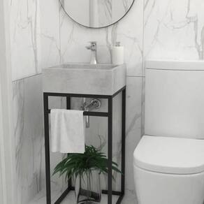 Base Box Iron 40x40 Cm Concreto Gabinete para Banheiro Base Box Iron 40x40 cm Concreto - Gabinete de ferro preto com estrutura tubular quadrada de 2 cm, acabamento em PU automotivo que protege contra ferrugem e proporciona alta durabilidade. A base dos pés é em plástico, oferecendo maior estabilidade e proteção ao piso. O tampo e a cuba são confeccionados em pedra ardósia Gold, uma matéria-prima natural conhecida por sua resistência e beleza, com acabamento em poliuretano que garante maior durabilidade e facilita a limpeza.