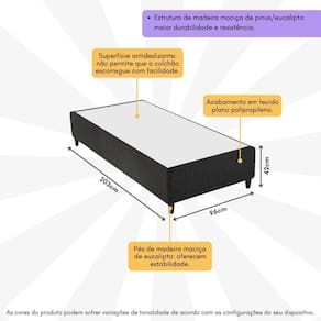 A Base Box Solteirão 96x203cm Rústico Alpha Inducol CR35246B é a combinação perfeita de elegância e conforto. Feita com madeira de pinus e eucalipto, esta base oferece uma durabilidade incomparável. Seu acabamento em tecido plano polipropileno proporciona um toque agradável e sofisticado, enquanto a superfície antideslizante não permite que o colchão escorregue com facilidade. Além disso, conta com pés de madeira de eucalipto, que garantem estabilidade, praticidade na higienização do ambiente, e seu design clean se adapta a qualquer ambiente.