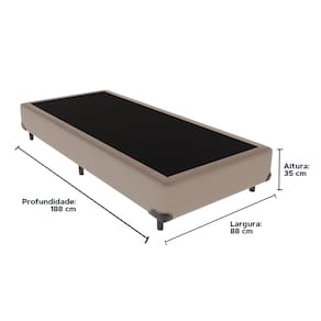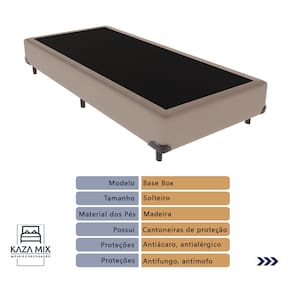 Base Box: Marca: KazaMix; Cor do Box: Bege; Tamanho: Solteiro; Dimensões: 88x188x18cm; (largura x comprimento x altura) Revestimento da Cama: Material Sintético; Material dos pés: Madeira; Estrutura: Madeira; Peso máximo recomendado: até 150kg de cada lado; Altura do Baú: 25cm; Altura dos pés: 10cm; Altura total: 35cm; Garantia: 03 meses; Selo Ecologicamente Correto.