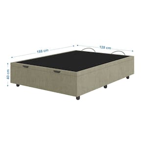 DIMENSÕES DA CAMA BOX BAÚ Altura total: 40 cm; Comprimento total: 188 cm; Largura total: 128 cm; Altura Interna: 28 cm; Altura dos pés: 6 cm; Suporta até 120 Kgs por pessoa. Peso: 28kg.