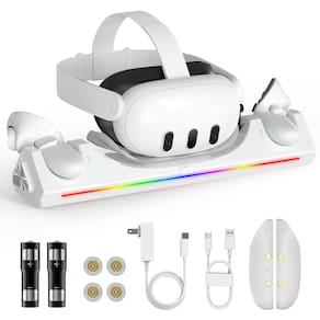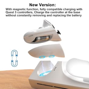 Base de carregamento para Oculus Quest 3S/Quest 3, estação de carregamento magnética para fone de ouvido e controles Meta Quest 3S VR, com 2 baterias recarregáveis de 2100 mAh, carregador e cabo USB-C, suporta indicador LED - Fone de ouvido de carregamento simultâneo e 2 controladores: nossa base de carregamento magnética recarregável é projetada especificamente para jogadores de elite. A estação de carregamento VR para Quest 3S/Quest 3 permite que você carregue convenientemente seu fone de ouvido e controles de toque ao mesmo tempo. Com um modo de carregamento estável e seguro, leva apenas 4-5h para carregar totalmente o fone de ouvido e o controle. - Indicadores LED e função de suspensão fácil: projetamos luzes LED em nossa base de carregamento VR para indicar o status de carregamento do fone de ouvido e controles de toque. A base fica azul ao carregar e fica verde quando totalmente carregada. Além disso, incluímos um botão de ajuste no meio que permite que você desligue facilmente as luzes indicadoras. - Economize dinheiro e seja ecologicamente correto: nossa base de carregamento para meta quest 3S/quest 3 inclui capas de controle e 2 baterias recarregáveis personalizadas que podem ser usadas mais de 1000 vezes. Isso não apenas economiza dinheiro com a substituição constante de baterias, mas também promove uma abordagem mais ecológica. As baterias reutilizáveis não são apenas econômicas, mas também mais seguras para o meio ambiente. - Configuração de jogos organizada e organizada: mantenha sua sala de jogos limpa e organizada com nossa estação de carregamento de realidade virtual. Oferece um espaço dedicado para armazenar seus fones de ouvido e controles de toque, garantindo que eles estejam sempre ao alcance e prontos para suas sessões de jogos. Diga adeus aos fios emaranhados e às áreas de jogos desordenadas. - Conjunto multifuncional para sua conveniência: nosso pacote inclui tudo o que você precisa para melhorar sua experiência de jogo Quest 3S/Quest 3. Você receberá 1 base de carregamento para Quest 3S/Quest 3, 4 conectores magnéticos USB-C para fone de ouvido, 2 baterias recarregáveis de 2100 mAh, 1 adaptador USB-C, 2 capas de bateria e um guia de boas-vindas.