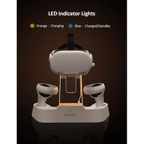 NexiGo Base de carregamento aprimorada com luz LED [liga/desliga] para Oculus Quest 2, [suporta alça Elite com bateria], suporte para exibição de fone de ouvido e suporte para controlador, 2 baterias - Projetado para jogadores Elite. Construído para carregar o Quest 2, a alça Elite e dois controles de toque simultaneamente, a base de carregamento NexiGo S20 foi projetada com o Elite Gamer em mente. Observação: não é compatível com as alças do controle. - ?Carregamento rápido?Carregue totalmente seu fone de ouvido e controles de toque em aproximadamente 3,5 horas. Após a conclusão da montagem, coloque o fone de ouvido na base de carregamento e conecte o cabo de carregamento magnético ao conector. - ?Economize tempo e dinheiro?As baterias recarregáveis e a tampa do controle ajudam a economizar você do ciclo infinito de substituições. - ?Indicadores LED convenientes?A estação de carregamento NexiGo é projetada com luzes LED na coluna de suporte e nos lados esquerdo e direito da base para indicar o status de carregamento do fone de ouvido e controles acoplados. É fácil dizer quando seus acessórios estão carregados: laranja durante o carregamento e azul quando totalmente alimentado. - ?Tela elegante?O suporte NexiGo armazena seu fone de ouvido Quest2, alça Elite com bateria e controles de toque em um só lugar para manter sua área de jogo limpa e organizada. Seu design elegante e luzes coloridas adicionam uma estética elegante à sua tela de realidade virtual.