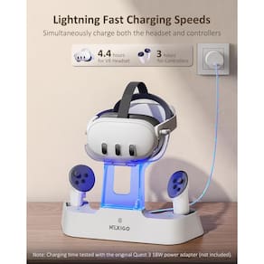 PortátilEspecificações: Entrada USB-C: 5V/4A Saída USB-A: 5V / 400mA Saída USB-A para fone de ouvido de carregamento: = 2000mA Saída da porta de carregamento do controlador: = 800mA x 2 Capacidade da bateria recarregável: 1850 mAh x 2 - ?Projetado para o jogador Elite?A base de carregamento NexiGo é projetada especificamente para carregar os fones de ouvido Quest 3 e 3S, controles e alça Elite com bateria. Com carregamento sem fio, é incrivelmente fácil carregar todos os seus dispositivos ao mesmo tempo para sessões de jogos ininterruptas. - Carregamento rápido: usando o adaptador de energia USB-C autêntico Quest 3 ou 3S 18W, o fone de ouvido VR pode ser totalmente carregado em apenas 4,4 horas e os controles atingem a capacidade total da bateria em apenas 3 horas. Diga adeus aos longos tempos de espera e desfrute de sessões de jogos ininterruptas com nossa solução de carregamento rápido. Carregue seu controle sem esforço sem remover a capa de silicone com os slots de carregamento fáceis de usar. - ?Indicadores LED convenientes?Projetado com indicadores de carregamento LED na coluna de suporte e nos lados esquerdo e direito da base para indicar o status de carregamento do fone de ouvido e controles acoplados. É fácil dizer quando seus acessórios estão carregados: laranja durante o carregamento e azul quando totalmente alimentado. - ?Proteção de carregamento?Esta base de carregamento oferece proteção abrangente para o seu controle e fone de ouvido durante o processo de carregamento. Inclui recursos de proteção contra sobrecarga, sobrecarga e sobrecorrente para garantir um carregamento seguro e confiável sem qualquer risco de danos ou mau funcionamento. Fique tranquilo sabendo que seus dispositivos estão protegidos durante o carregamento. - ?Economize tempo e dinheiro?Este pacote inclui baterias recarregáveis e capas de controle, eliminando a necessidade de substituição frequente de bateria. Aproveite a conveniência das baterias recarregáveis e economize tempo e dinheiro. O suporte armazena seu fone de ouvido Quest 3 ou 3S, alça Elite com bateria e controles de toque em um só lugar, mantendo sua área de jogo organizada.