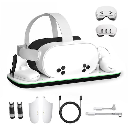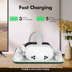 Nome do item: Estação de carregamento VR Conteúdo da embalagem: 1 base de carregamento VR. 2 pilhas recarregáveis; 2 capas de baterias de reposição; 1 cabo de carregamento USB-C; 1 manual do utilizador (sem garantia de versão em português). Cabo de carregamento de 3 peças: USB-C (adaptador de carregamento não incluído). - Estação de carregamento conveniente: a estação de carregamento compatível com o Meta Quest 3 e Meta Quest 3S oferece a conveniência de carregamento rápido. Pode carregar seu fone de ouvido VR e controles simultaneamente, garantindo que seu equipamento VR esteja sempre pronto para a próxima experiência imersiva (aconselhamento: certifique-se de que as tiras prateadas das baterias fiquem voltadas para fora, caso contrário, os controles não carregarão!) - Indicador de carregamento LED acessível: a estação de carregamento tem luzes indicadoras elegantes: laranja para carregamento e verde para totalmente carregada. Você pode ligar e desligar convenientemente os LEDs usando o interruptor localizado na parte traseira da base - Proteção de carregamento estável: vários recursos de segurança, incluindo proteção contra sobrecarga, curto-circuito e superaquecimento, garantem um carregamento seguro e estável para seus dispositivos - Baterias recarregáveis incluídas: inclui 2 pilhas recarregáveis de 1850 mAh para controladores, cada uma oferecendo até 1000 ciclos de carga, reduz o incômodo e o custo de substituições frequentes de bateria - Opção de armazenamento organizado: crie um ambiente de jogo limpo e organizado com nossa estação de carregamento de realidade virtual, que oferece um local dedicado para seus fones de ouvido e controles touch plus, garantindo que estejam sempre acessíveis para sessões de jogos. Ao mesmo tempo, também reduz a complexidade de armazenar seu equipamento após cada uso