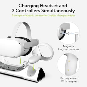 Este carregador VR Oculus Quest 2 apresenta design de linha suave e luz ambiente com indicador LED. Não é apenas uma estação de carregamento, mas também um adorável suporte Quest 2 para armazenamento Quest 2. - Acessórios indispensáveis para entusiastas do Quest 2: com um design decente e feito sob medida, esta base de carregamento foi especialmente construída para carregar simultaneamente o fone de ouvido Quest 2, pulseira de elite com bateria e controladores. - Carregue rapidamente seu vr quest 2: o fone de ouvido quest 2 leva de 2,5 a 3,5 horas para ser totalmente carregado e os controladores quest 2 são totalmente carregados em 4 horas. Ao carregar a alça, o fone de ouvido e a alça Elite ao mesmo tempo, isso prolongará o tempo de carregamento. - Design de carregamento por atração magnética forte: basta colocar o fone de ouvido VR e os controladores na estação de carregamento para carregar. A tampa da bateria com ímã facilita a colocação dos controladores. - Desempenho de carregamento estável e seguro: as várias proteções de carregamento integradas garantem a segurança e a confiabilidade do suporte de carregamento. Além disso, a tecnologia de gerenciamento de circuitos microinteligentes repara as baterias de forma automática e eficaz. - Luz ambiente elegante do indicador LED: monitoramento mais fácil do status de carregamento pelos indicadores LED verde e azul. Além disso, você pode desligar a luz LED enquanto dorme e o suporte de carregamento continuará carregando. - O que você obtém: base de carregamento ZYBER para quest 2, adaptador de alimentação 5V/3A x1, baterias AA Ni-MH recarregáveis x2, tampas de bateria x2, conector magnético de fone de ouvido x4, cabo USB-C para USB-C x1, manual de uso x1, garantia de 18 meses.