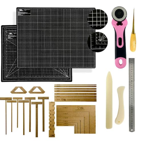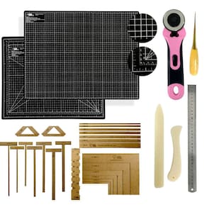Quer trabalhar com Encadernação, Cartonagem e Scrapbook, e está precisando de um conjunto de ferramentas completo para te ajudar? Não procure mais... Temos a solução ideal para você! Kit com base de corte dupla face e flexível que serve como área de trabalho, possui a medida de 60cm x 45cm, excelente para organizar seu espaço, proteger seus moveis, cortar papeis, tecidos entre outros. Enviamos também um kit completo de réguas e Gabaritos em MDF para Scrapbook e artesanato. 7 - Gabaritos  Medidas 6mmx30cm, 8mmx30cm, 10mmx30cm, 12mmx30, 15mmx30cm, 18mmx30cm, 20mmx30cm 2 - Réguas Fio de Cabelo 7- Esquadros  Medidas: 30x22cm ( largura 5cm), 25x17cm (Largura 4cm), 21x13cm (Largura 3cm), 18x10cm (Largura 2cm), 16x8cm (Largura 1,5cm), 14,5x6,5cm(Largura 1cm) 7- Gabaritos em T Medidas: 6mmx32cm, 8mmx32cm, 10mmx32cm, 12mmx32cm, 15mmx32cm, 18mmx32cm, 20mmx32cm 1- Gabarito para Wire O (fio) 2x1 e 3x1 Medidas 2x1(Lado Direito): 5/8 120 Folhas, 3/4 140 Folhas, 7/8 180 Folhas, 1" 200 Folhas, 1 1/8 250 Folhas, 1 1/4 270 Folhas. Medidas 3x1 (Lado Esquerdo): 1/4 25 Folhas, 5/16 50 Folhas, 3/8 60 Folhas, 7/16 85 Folhas, 1/2 95 Folhas, 9/16 110 Folhas.  Enviamos uma régua de metal de 60cm 2 ferramentas para dobrar e Vincar. 1 Cortador Manual de tecidos e papel com disco de 45mm. Agulhão furador com cabo de madeira  Descubra a facilidade de fazer cadernos, capas, agendas entre outros com esse Kit completo, você poderá fazer cortes precisos em qualquer material sem ter que se preocupar em danificar as superfícies ou desperdiçar material. Desbloqueie seu potencial criativo! Compre agora o Seu kit completo e facilite os projetos de artesanato e patchwork.