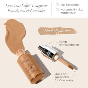 — base e corretivo multitarefa: Love Your Selfie 4 em 1 da PÜR é uma base e corretivo de longa duração com infusão de cuidados com a pele de cobertura média a total que ajuda instantaneamente a esconder, corrigir e melhorar a aparência da pele com uma cobertura perfeita.