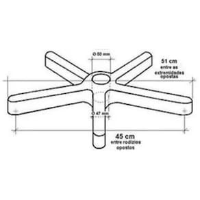 Base giratória, com patas em aço carbono, tubular, de secçao semi oblonga com dimensões mínimas de 20x39x120mm com reforço de solta mig e raio de 280mm Permite junção de rodízios ou sapatas plásticas deslizantes por meio de ponteiras com encaixe de 11mm. Capacidade: Peso Recomendado : Usuário de até 120 Kg Cores Disponíveis: Preto Padrão de envio: Preto Secretária diametro Total: 570mm