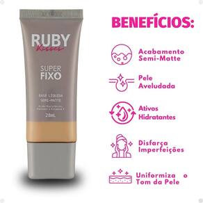 A Base Líquida Super Fixo da Ruby Kisses é sinônimo de pele bem preparada e com aspecto natural. Com toque seco e acabamento semi-matte, ela proporciona um aspecto aveludado para a pele. Sua nova fórmula contém Ácido Hialurônico, Pantenol e Vitamina E, que possuem ação antioxidante e hidratante. Possui fórmula de média cobertura, que permite a construção de camadas, e performance de longa duração .