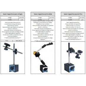 As Bases Magnéticas são utilizadas para fixação de ferramentas de medição, como relógios comparadores. Possui grande praticidade, possuindo em sua parte superior uma rosca, permitindo vários tipos de adaptação.