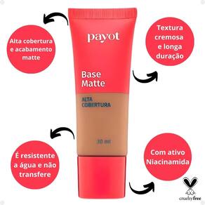 A Base Matte possui fórmula de alta cobertura com acabamento matte perfeito. Textura cremosa, longa duração, resistência a água e não transfere. Desliza facilmente na pele e uniformiza o tom. Proporciona uma cobertura natural. Com ativo Niacinamida. Fórmula oil-free, não comedogênica. Para todos os tipos de pele. Hipoalergênica. Dermatologicamente testado. Sem ingredientes de origem animal. Sem fragrância, parabenos e álcool.