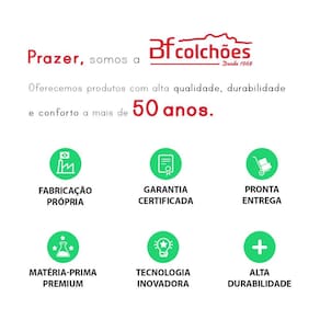 Com todo o know how de mais de 50 anos de fabricação de colchões de mola e espuma, nasce a Marca BF Colchões, mais uma empresa do grupo F.A.Uma marca forte, inovadora e que traz ao Brasil a última palavra em tecnologia em colchões, revolucionando a sua experiência de dormir! A indústria é fiscalizada a cada 3 meses pelo Instituto Nacional de Estudos do Repouso - INER ( Pró- Espuma) - que foi criado em 1984 e tem como objetivo regulamentar o mercado de colchões de espuma, oferecendo ao consumidor um produto com uma qualidade superior. Com normas mais rigorosas de controle de qualidade que a ABNT e INMETRO, somente 5 fabricantes tem o direito de usar o Selo INER - Qualidade Pró Espuma. Fique atento ao selo ao comprar seu colchão! Além disso, a indústria foi Re-certificada no novo sistema NBR ISO 9001:2015 desde Novembro de 2017 etemos a Certificação para toda a linha de Colchões de Espuma, .º 79 , de 03 de fevereiro de 2011. e Portaria n.º 349, de 09 de julho de 2015. E em toda a linha de colchão de Mola Portaria nº 52, de 01 de fevereiro de 2016. A marca mantém-se antenada nas inovações de mercado através da associação com a ISPA (Internetional Sleep Products Association) e com associação da ABICOL (Associação Brasileira das Indústrias de Colchões). Utilizando apenas matérias primas de primeira qualidade e dos maiores e melhores fornecedores internacionais, seu colchão dos sonhos é feito com muito cuidado e carinho aliado ao mais avançado conhecimento médico, científico e tecnológico para proporcionar uma noite de sono perfeita