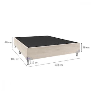 Características: - Altura do box sem pés: 28 cm - Material da estrutura: Madeira em Pinus 4 mm - Colchão : 138x188 cm -não incluso- - Tecido: Sued - Modelo do Box: Vazado - Não possui anti-derrapante - Não possui tratamento anti-cupim - 07 pés fixos de 12 cm -kit pés estará armazenado dentro do TNT- - Suporte de peso: 120 kg cada lado - Tempo de garantia: 3 meses