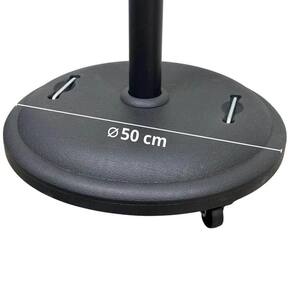 Além disso, a base é equipada com rodas, facilitando o seu transporte e movimentação. Se você precisa reposicionar o seu ombrelone frequentemente ou quer mudar a disposição dos móveis de jardim, as rodas integradas permitem que você movimente a base sem esforço, mesmo quando o ombrelone estiver montado. Isso garante mais flexibilidade e facilidade no uso diário, sem comprometer a estabilidade do seu produto.