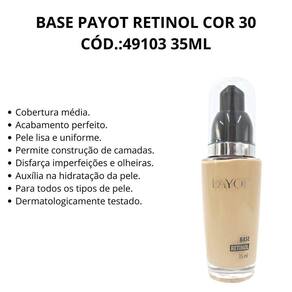A Base Retinol é maquiagem e tratamento cosmético em um só produto. Proporciona acabamento perfeito, pele lisa e uniforme. Fórmula de média cobertura, que permite a construção de camadas, disfarça poros, imperfeições e olheiras. Uniformiza o tom da pele com acabamento natural. Sua fórmula com Retinol Vegetal Ajuda a prevenir o envelhecimento precoce e devolve o viço da pele. Contribui na redução da aparência de rugas, linhas de expressão e auxilia na hidratação.