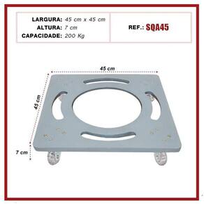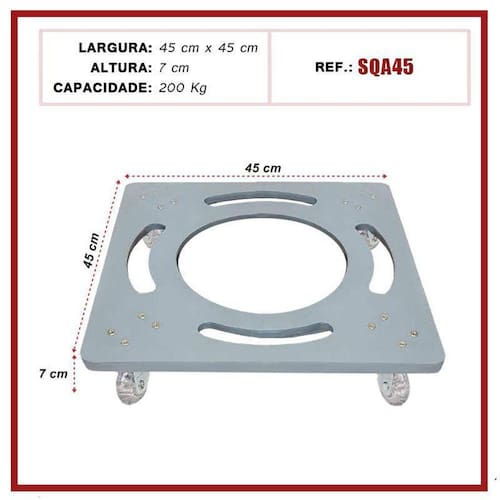 Base Suporte De Alumínio Quadrado Com Rodízios Gel Vaso 45CmSuporte de alumínio Quadrado com rodinhas de silicone gel anti-risco e anti ruido.Ideal para facilitar a locomoção de objetos em geral, como vasos de plantas, eletrônicos, eletrodomésticos, entre outros.Em qualquer ambiente, sem ruídos e sem riscar ou danificar o seu piso4 rodízios giratórios - suportam até 200 kgModelo SQA45Medidas técnicas do suporte: Altura total: 7 cm; Largura da base: 45x45 cm;Medidas técnicas do rodízio:Contém 4 rodasDiâmetro da roda: 50 mm;Vantagens:· grande durabilidade e resistência;· não enferrujam;· não riscam;· antirruídos;· suportam grande quantidade de peso