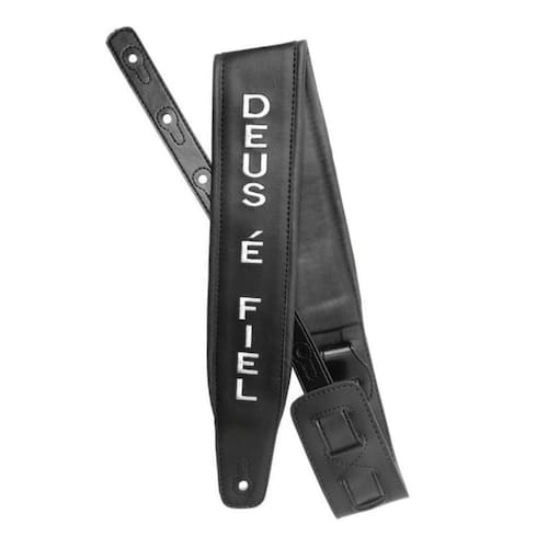 DEUS É FIEL PRETO CLASSIC PRETO Correia em sintético BORDADA DEUS É FIEL, forrada com material sintético para evitar a absorção do suor, deslizando sobre o ombro do músico. Possui ESPUMA interna para maior conforto. Desenvolvida para distribuir uniformemente o peso do instrumento no ombro do músico, possui 7,5 cm de largura. A ponteira onde o instrumento é engatado foi desenvolvida com um reforço interno em couro a fim de não esgaçar evitando escapar do instrumento. Possui regulagem variável entre 1,22 e 1,45mts de comprimento, a fim de ajustar a melhor altura para o músico.