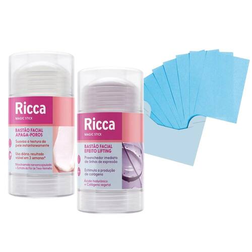 BASTÃO CUIDADO FACIAL APAGA-POROS e EFEITO LIFTING RICCA +50UN LENÇO REMOVEDOR DE OLEOSIDADE CONTÉM: 01UN BASTÃO FACIAL APAGA-POROS 30G MAGIC STICK RICCA 01UN BASTÃO FACIAL ELEITO LIFTING 30G MAGIC STICK RICCA 01UN LENÇO DE PAPEL REMOVEDOR DE OLEOSIDADE 50 FOLHAS