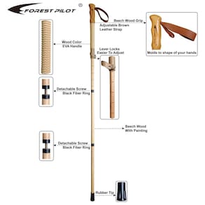 O bastão ajustável de madeira de faia da FOREST PILOT é uma combinação inovadora de material de faia natural e estrutura de comprimento ajustável. O material de faia oferece suporte forte que não vai dobrar ou quebrar mesmo sob grande pressão; Em segundo lugar, o comprimento ajustável torna mais conveniente e prático para caminhantes com alturas diferentes; Em terceiro lugar, todo o bastão é coberto com pintura impermeável transparente em caso de clima úmido durante caminhadas ao ar livre; Em quarto lugar, 3 tipos de pontas, incluindo ponta de borracha, ponta de ferro melhorada e cesta de lama ajudarão os caminhantes a conquistar vários terrenos; Finalmente, a bolsa de couro exclusiva não é apenas bonita e moderna, mas também protege o bastão de trekking muito bem após a caminhada. - ?Mais resistente do que alumínio 7075? - A madeira de faia resistente dos bastões Forest Pilot Trekking pode suportar pressão e impacto melhor do que o alumínio 7075 ou fibra de carbono, suportando seu peso mais pesado. - ?Estrutura e pintura de mastros de madeira de faia? - Artesanato puro em todo o mastro, o cabo de madeira de faia está em conformidade com a engenharia humana, 4 anéis de fibra aumentam a força de impacto lateral dos postes. Pintura à prova d'água e ecológica na superfície. O revestimento de tinta transparente protege o mastro de trekking de um ambiente externo úmido. - ?Mais fácil de ajustar? - Aperte os parafusos dos postes 1-2 e 2-3, escolha o nível certo de parafuso de bloqueio e a altura dos postes de mudança de 117 a 139 cm. Feche a trava flip. Todo o mastro pode ser dividido em 3 peças curtas, colocadas na bolsa após a caminhada terminar e colocadas em sua bolsa. Fácil de transportar - ?3 tipos de ponta de caminhada? – A ponta de borracha pode aumentar o atrito ao caminhar no chão; a ponta de ferro pode ser inserida no chão ao caminhar em uma floresta profunda; a cesta de lama pode ser usada ao caminhar em uma estrada lamacenta. - ?Alça de EVA de 3 cores/alça de couro?A cor preto/verde/marrom da alça macia de EVA combina com a alça de couro ajustável. Cor preto/verde/marrom da bolsa feita de couro e tecido de rede.