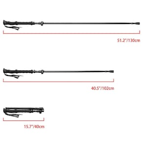 O diabo está nos detalhes. Nós nos preocupamos com sua segurança! Feitas de liga de alumínio durável de alta qualidade, nossas bengalas dobráveis são leves, com altura ajustável e design antichoque, tornando este mastro de caminhada dobrável um bastão de caminhada extremamente seguro e confiável. Ideal para viagens, caminhadas, acampamentos ou utilizado como uma bengala comum para ajudar a equilibrar. Especificações: -- Material: liga de alumínio 7075 -- Comprimento máximo estendido: 130 cm. -- Tamanho dobrado: 16,5 polegadas (41,9 cm) --Peso: 0,31 kg Observação: - O tamanho pode ter uma pequena variação devido à medição manual. Embalagem: -1 bengala dobrável, preto escuro. - 1 estojo de transporte. -1 x ponta de mastro de borracha de substituição. - ? O melhor bastão de trekking dobrável, feito de liga de alumínio de grau aeroespacial 7075, ABS de qualidade premium e alça de espuma EVA, oferece a esta bengala uma durabilidade e segurança incríveis. - ? Bengala dobrável para viagem, cada mastro de caminhada pode ser estendido para 130 cm. Rápido e fácil de ajustar à mão, adequado para diferentes alturas de adultos. - ? Poste de caminhada leve e ajustável, com um tamanho dobrado de 42 cm e peso de 0,31 kg, esta bengala dobrável pode ser facilmente colocada em uma mochila. Ótimo para viagens, caminhadas, caminhadas ou funciona como um dispositivo estabilizador para ajudar a equilibrar. - ? Alpenstock confortável e antichoque, o cabo de bengala é projetado para contornar o formato da sua mão, para facilitar e confortável de segurar. Estes bastões de absorção de choque podem reduzir as tensões nas mãos e no pulso. - ? Bastão de caminhada antiderrapante, adota uma estrutura resistente e pé de borracha ultra-aderente, permitindo uma aderência firme para caminhadas em terrenos rochosos e irregulares, tornando-se uma bengala de caminhada extremamente segura e confiável.