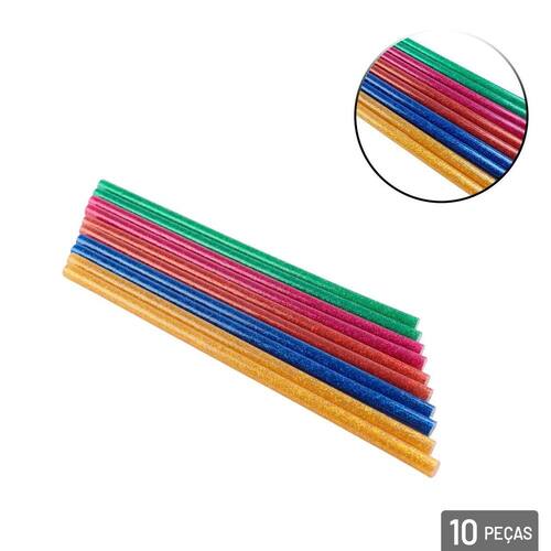 Bastão de Cola Quente 10 Pçs Fino Refil 07m Cola Quente em bastão com glitter, ideal para trabalhos artesanais e escolares. Para uso em outras superfícies realizar teste de compatibilidade da cola. Espessura: Fina. Medidas: 07mm x 19cm.\nEspecificaçoes: Marca : C3B\nTipo de material : EVA, Glitter\nCores ou Estampa : Colorido\nDimensões do Produto : 19 X 0,7 X 0,7 CM\nDimensões da Embalagem : 24 X 7 X 0,5 CM\nPeso Bruto (Gramas) : 0.076 Marca: Não Informado