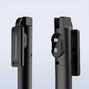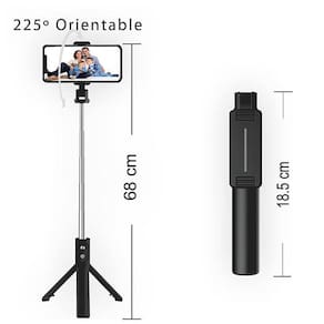Tripé retrátil, controle Bluetooth destacável, comprimento extensível de 18,5cm a 67cm, peso do produto 130g, bateria CR1620 substituível (3V, 70mAh), versão sem fio 4.0 (VIP), compatível com IOS e Android.